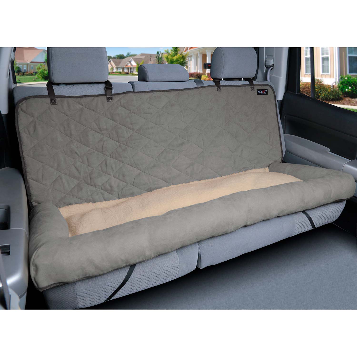 The PetSafe Happy Ride Quilted Bench Seat Cover, made with heavy cotton twill fabric, provides extra durability to protect your seats from dog hair and wet, muddy paws. This waterproof bench seat cover fits the back seat of most cars, trucks and SUVs, measuring 45 inches long by 56 inches wide. The cover is easy to use; just secure the head straps and seat anchor tubes in place and use the elastic panels and lower straps to keep the cover snugly fit to your car seat. If your seat cover is ready to be cleaned at the end of a fun-filled day with your best friend, simply toss the cover into your washing machine. PetSafe brand is here to help you and your pet live happy together.