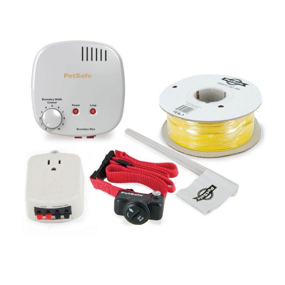 Basic In-Ground Fence keeps your pet safely contained and secure in your yard. Install the system in about a weekend by setting up the transmitter and burying wires around your yard. The fence covers up to 5 acres with additional wire and flags. You'll place flags around your yard and train your pet where his new yard boundaries are in fun, quick training sessions over the next 2 weeks.